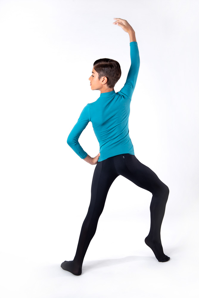 Calça aderente com pé e costura vertical na parte de trás das pernas.