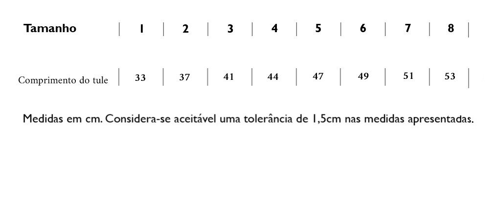Do tamanho 1 ao 8. Consulte o Guia de Tamanhos.